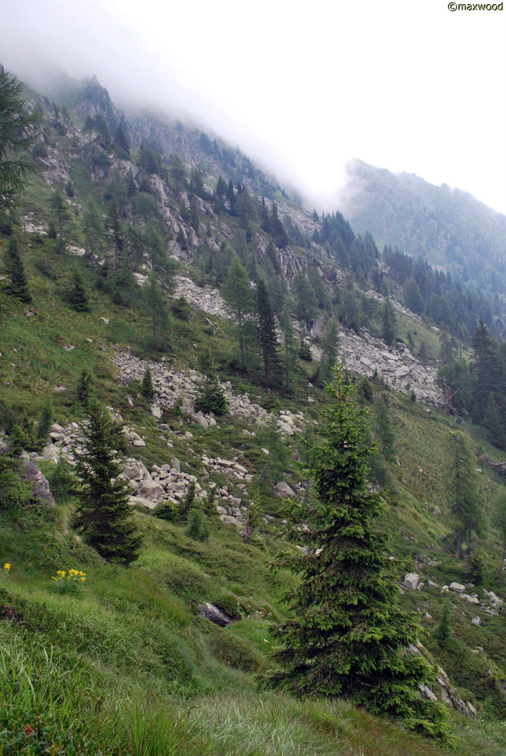 Ci muoviamo velocemente in direzione del Lago Lambin (2324) seguendo il sentiero 232. Il sali e scendi iniziale lascia ben presto il posto ad una lunga discesa che comincia poco prima del lago. L'intensità della pioggia aumenta e non calerà più. Le ultime foto le ho scattate proprio qui. Poi è tutta una lunga corsa fino alla macchina.
